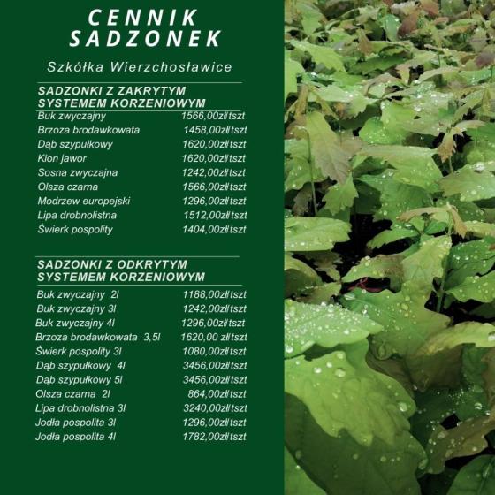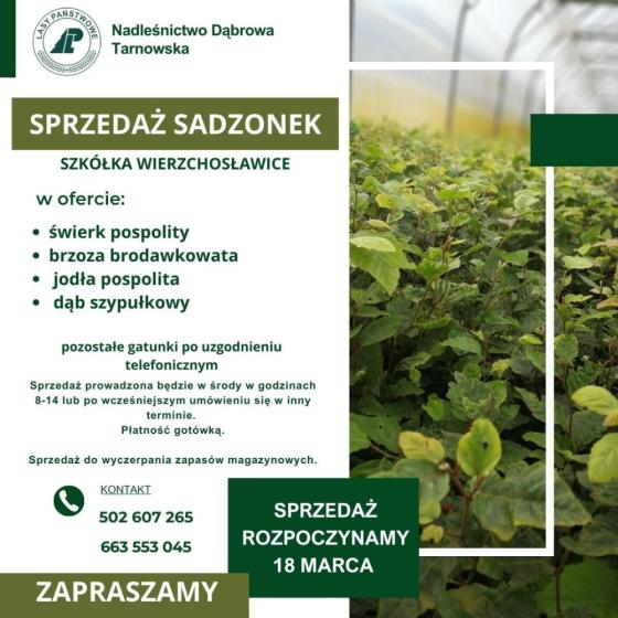Sprzedaż prowadzona jest do czasu wyczerpania zapasu sadzonek lub po wcześniejszym uzgodnieniu telefonicznym terminu z leśniczym. Jednocześnie sprzedający zastrzega sobie prawo do przerwania sprzedaży w przypadku wystąpienia warunków atmosferycznych uniemożliwiających sprzedaż. W ofercie: świerk pospolity, brzoza brodawkowata, jodła pospolita, dąb szypułkowy. Pozostałe gatunki będą oferowane w miarę możliwości – zachęcamy do uzgodnień telefonicznych.